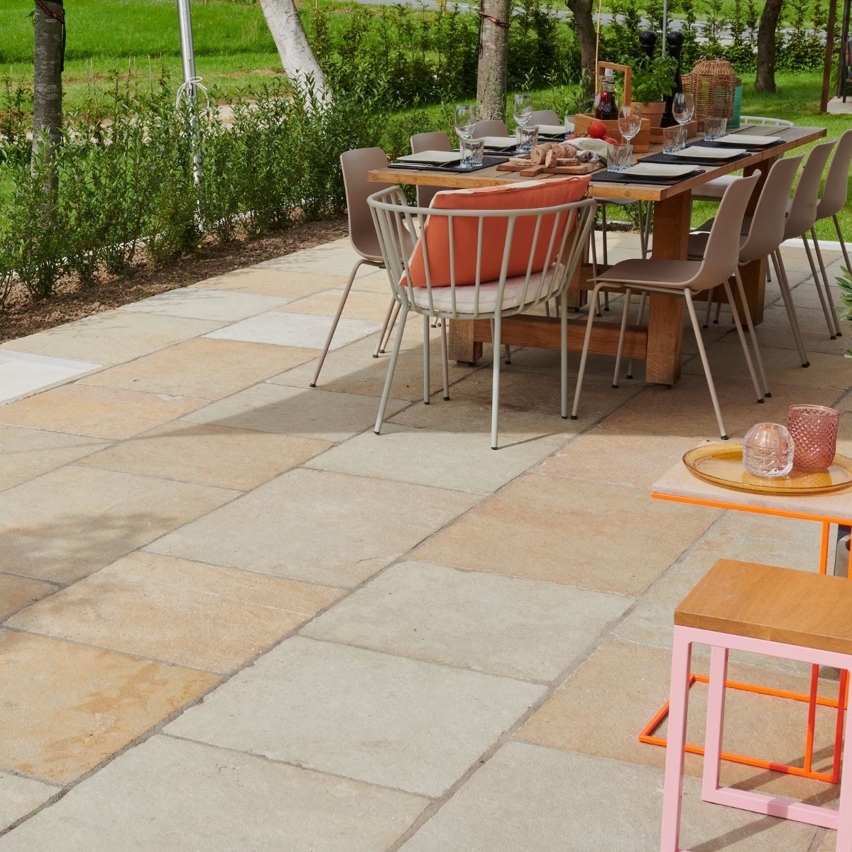 Kalkstein-Terrassenplatten für Außenflächen – ruhige Optik, elegante Wirkung und zeitloses Design.